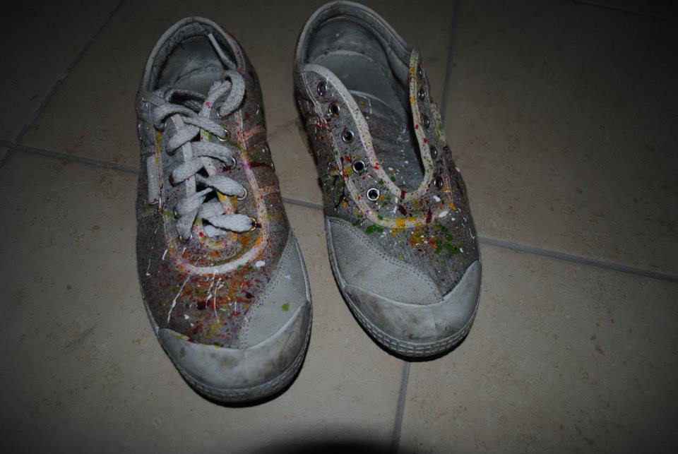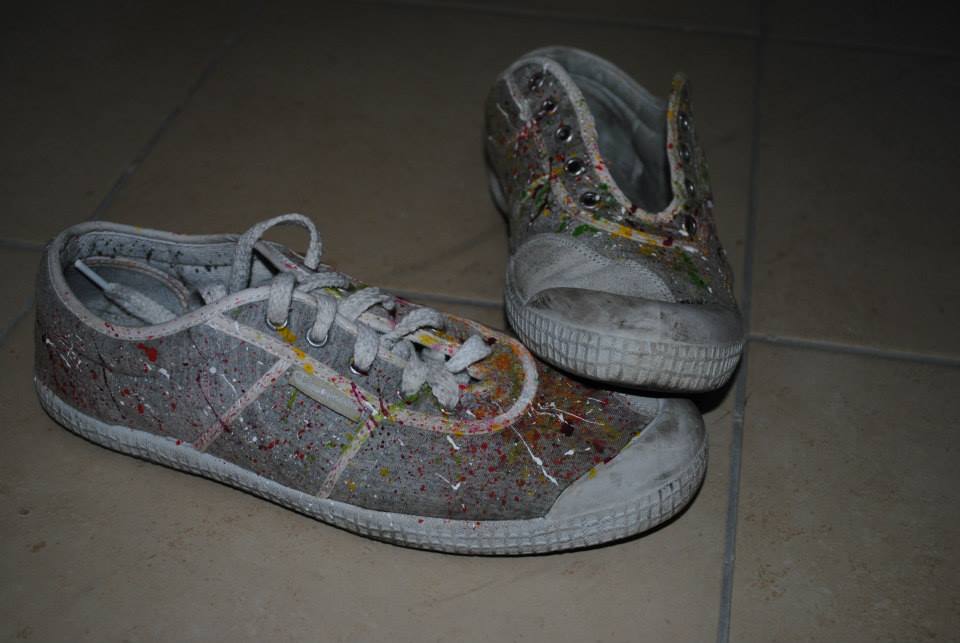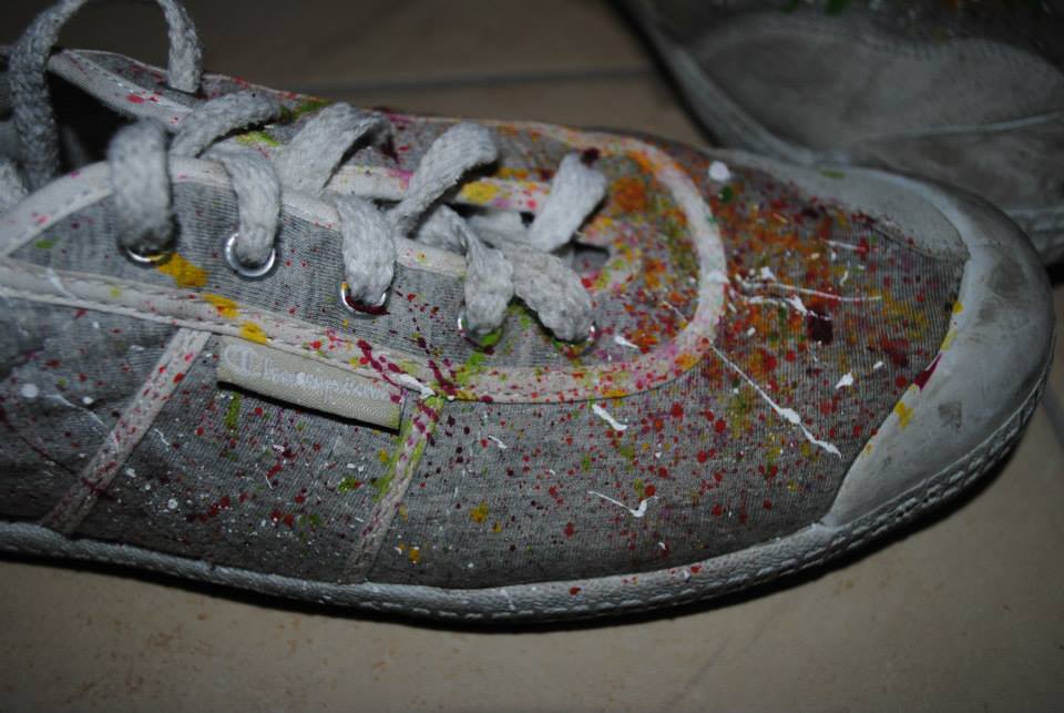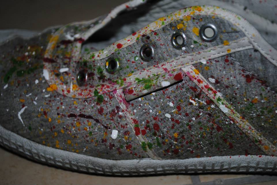 STEP 3 # Divertitevi con il colore!!! : Prendete degli acrilici per tessuti di tanti colori e incominciate, uno alla volta a schizzarli su tutta la scarpa;