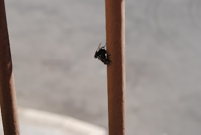 Non so come mia sorella abbia notato dietro la tenda della finestra, fuori dal balcone, sulle grate, una macchia nera di cui non riusciva a capacitarsi la provenienza, ma ci è riuscita!!!. Si è avvicinata, incuriosita e ha trovato due mosche in questo stato. Appena aver capito che cosa aveva trovato mi ha chiamata urgentemente come se si fosse trovata in chissà quale pericolo, per poi dirmi che in realtà voleva fare una bella foto a quel momento così intimo tra queste due povere mosche ignare di essere osservate. La cosa sorprendente non è stato il fatto che ho accettato la sua proposta e aver preso subito la macchina fotografica, noo non quello!!!! La cosa assai curiosa è stata la posizione in questione e la nitidezza della foto che non lascia equivoci. Non ho idea di come si riproducano le mosche ma qualcosa qualcosa c'era là, sotto quel groviglio di zambe. Se avete delle foto curiose o vi trovate in momenti imperdibili per avere poi dei ricordi visivi di quella esperienza, non fate altro che prendere la vostra macchina fotografica e fare tante foto a quel momento.!!!!!