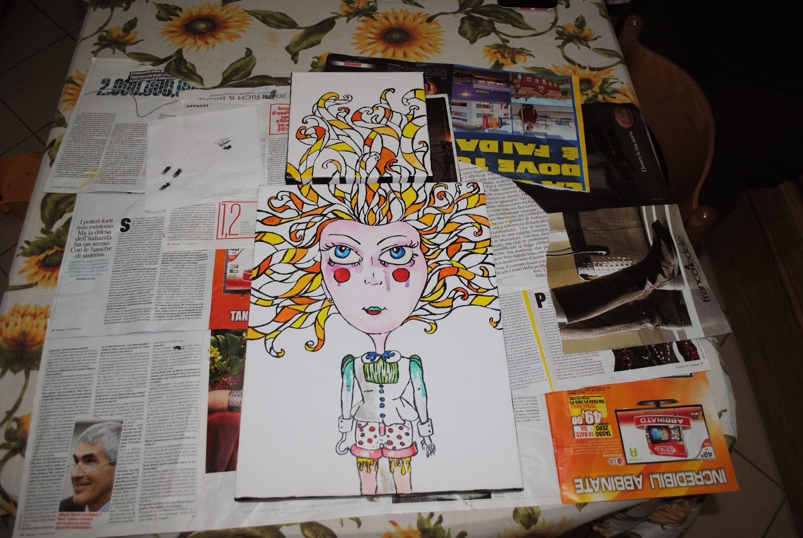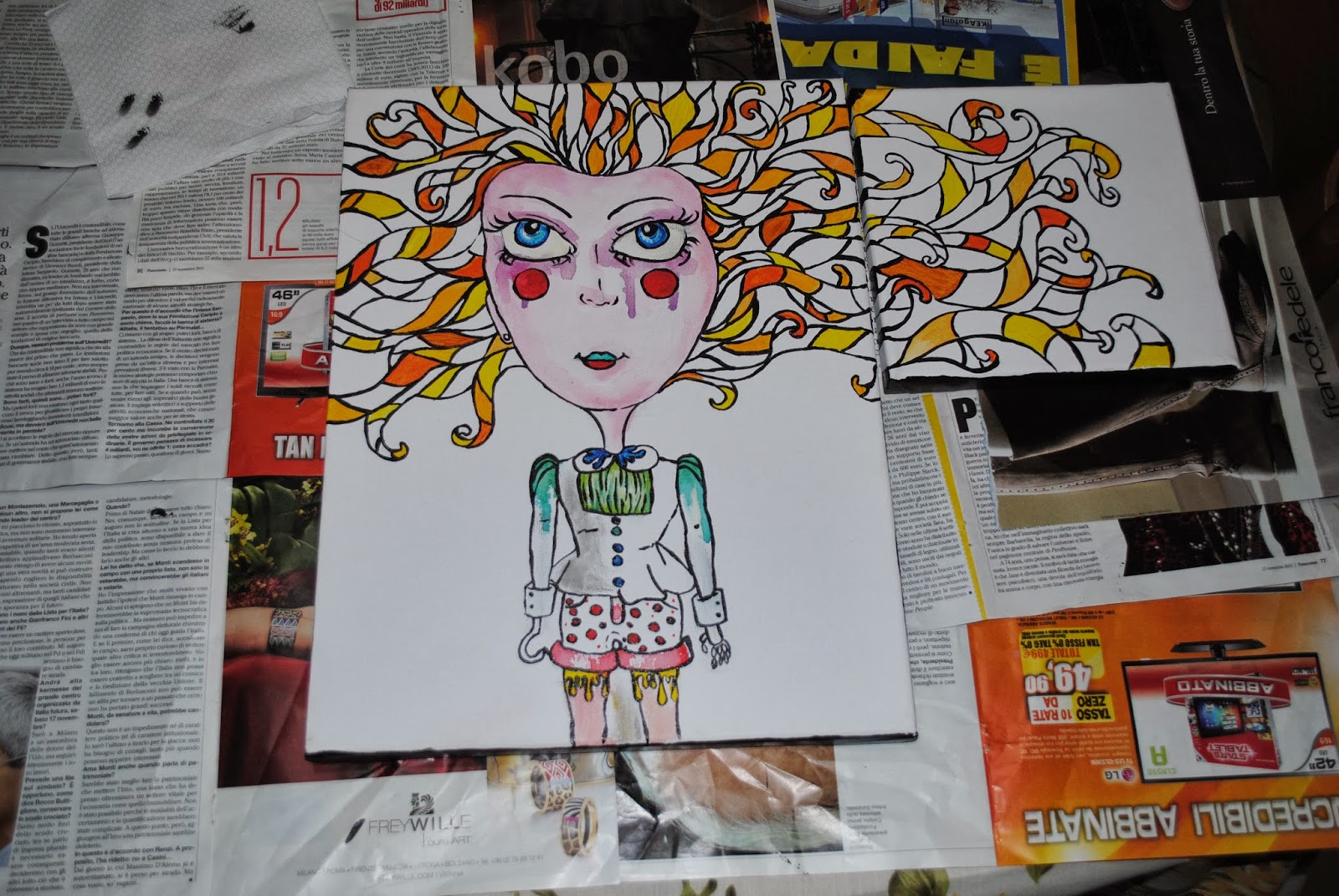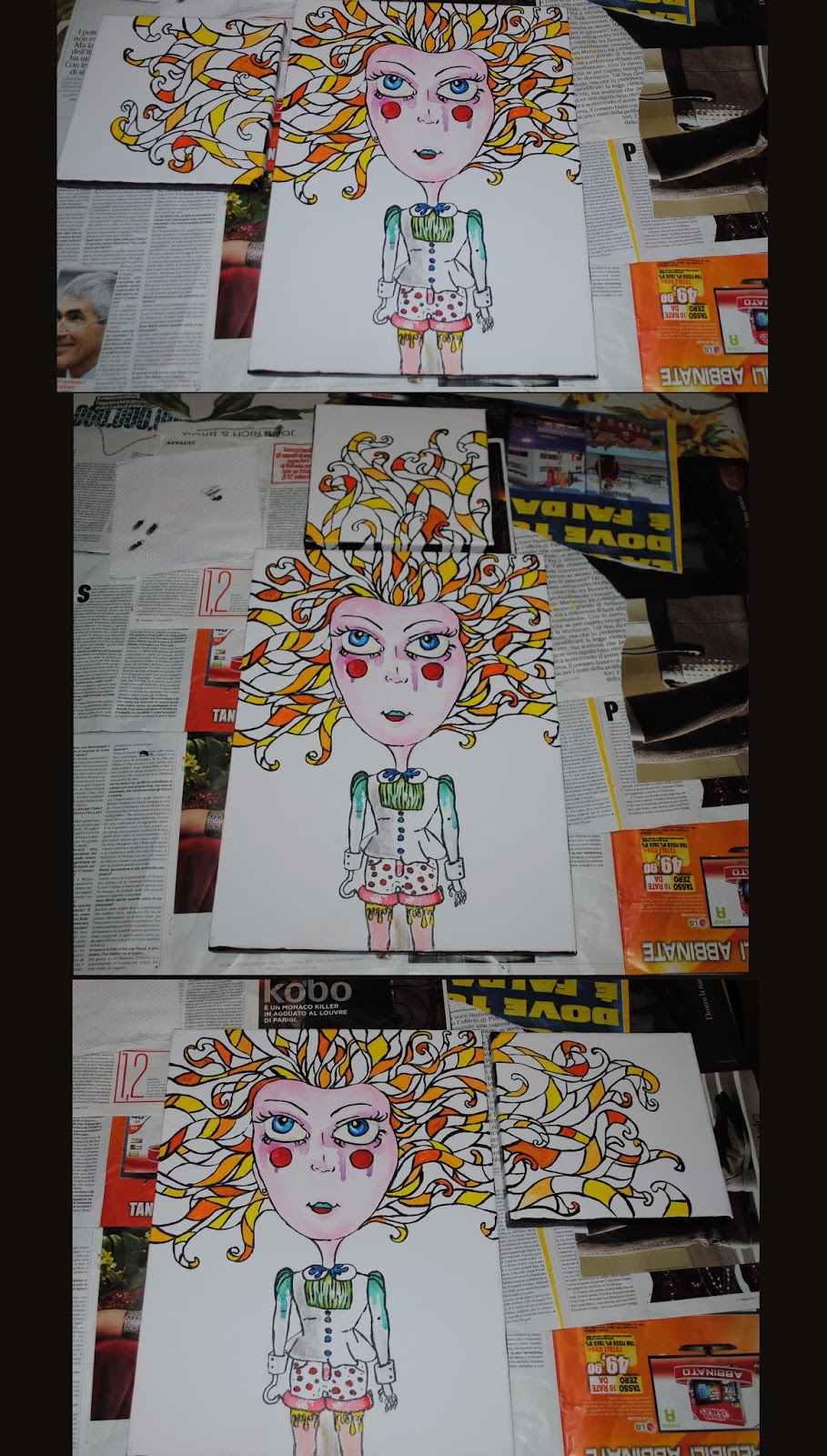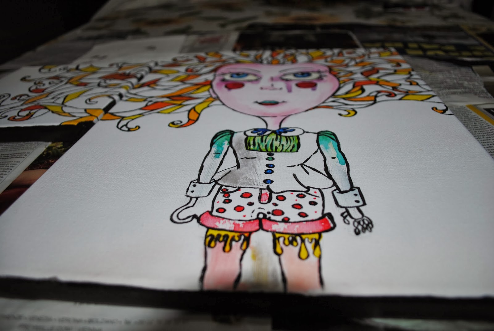 Da poco che sto cercando di ricreare, studiare e approfondire lo stile che mi piacerebbe avere nelle mie creazioni fatte a mano. Recentemente, infatti, ho scoperto di avere questa mania di costruire dei personaggi un pò cartoon con gli occhi grandi. Dopo varie bozze, una grossa spesa nel mio negozio di articoli da disegno preferito e un enorme tavolo a mia disposizione per lavorare, sono riuscita a fare questo.