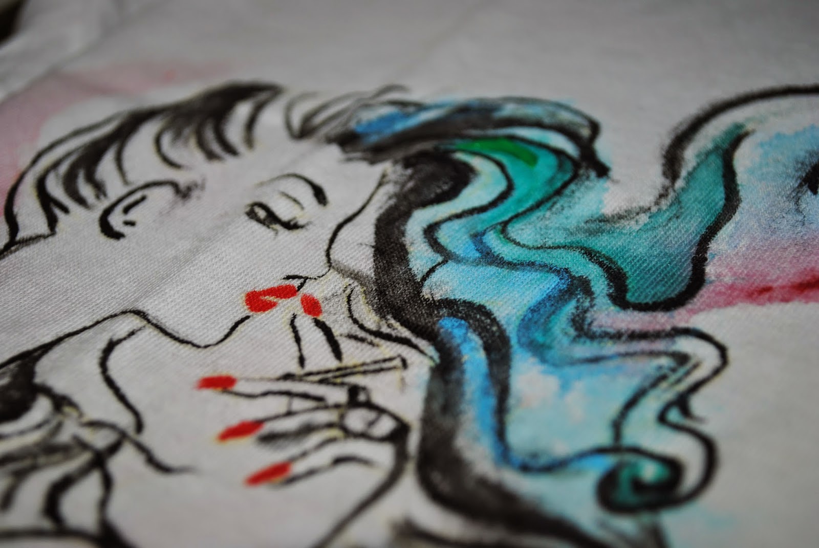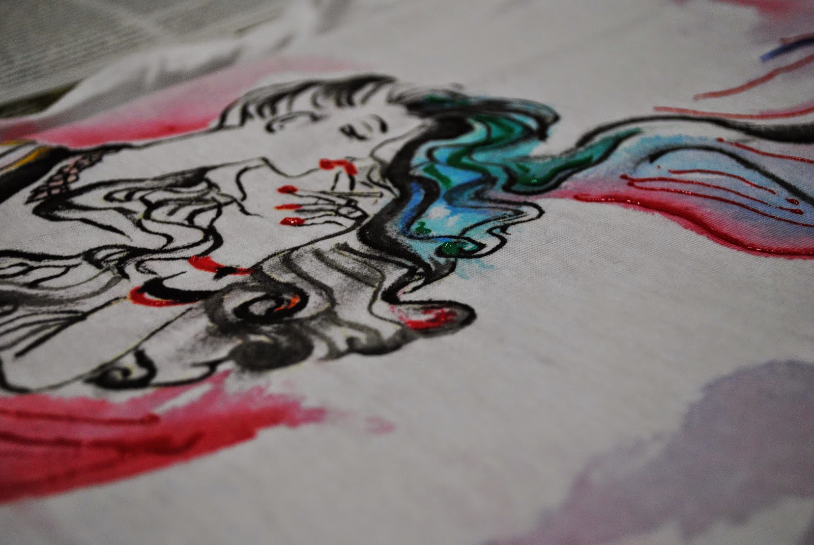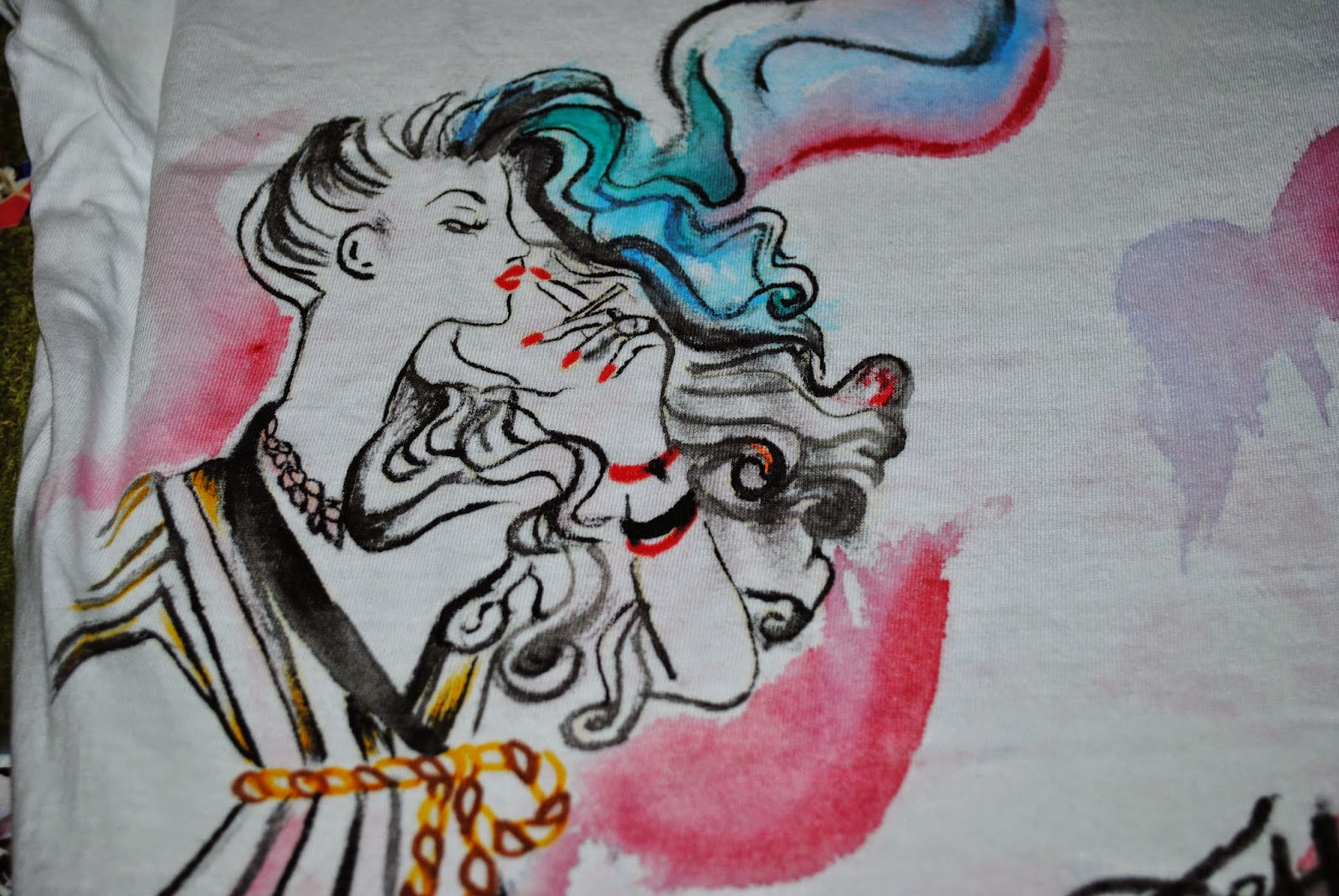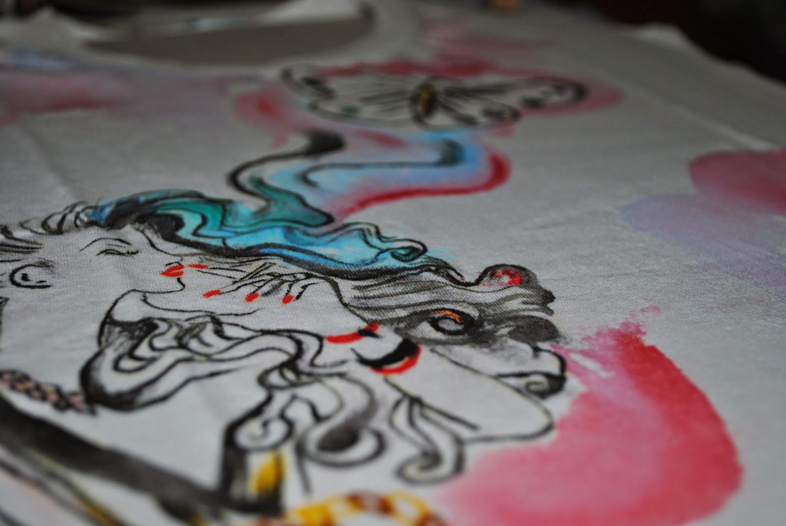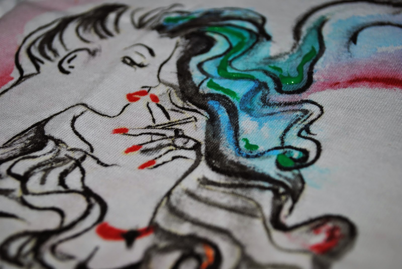 Come vedrete dalle foto, ci sono alcune parti del disegno sulla t-shirt molto rialzate. Dopo aver visto alcuni lavori di Alisa Burke alcune settimane fa non ho potuto che provare anche io i colori 3D per tessuti e altri materiali. Il disegno che vedete rialzato più degli altri non si sgonfierà con un piccolo puff ma resterà così.