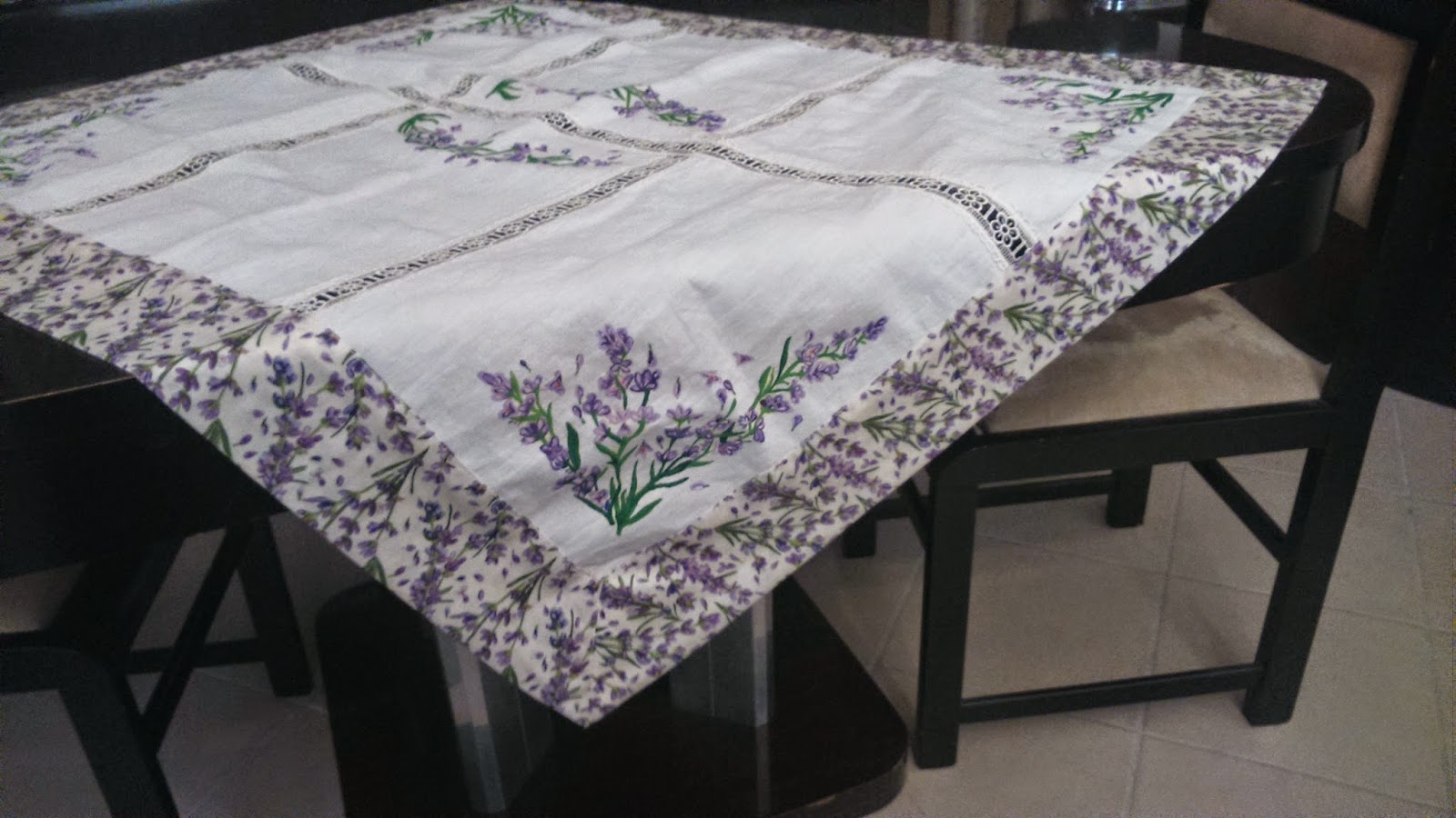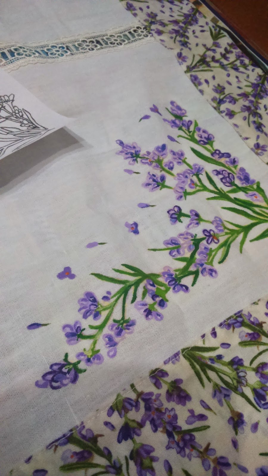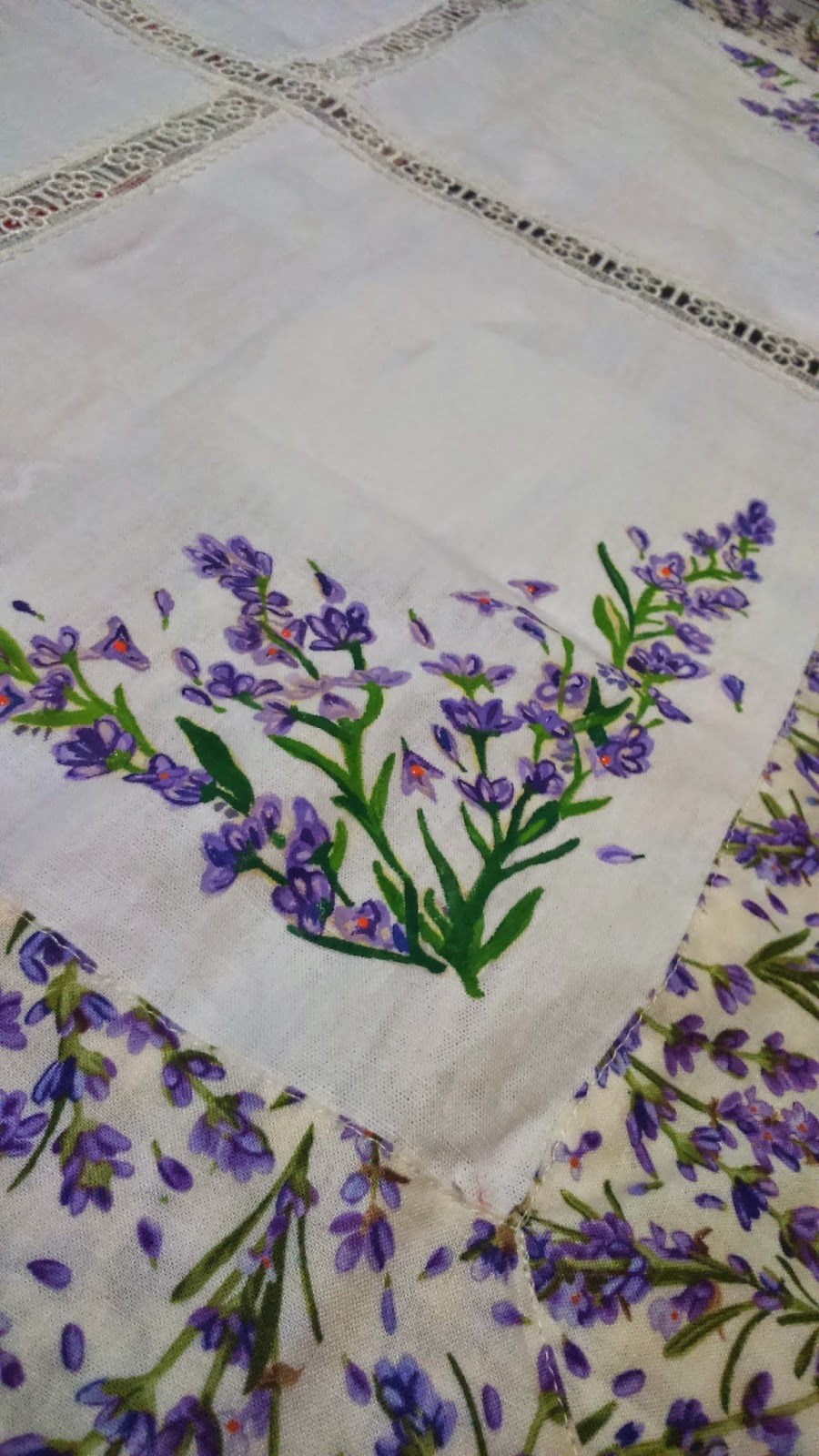 Tempo fa mi commissionarono una tovaglia. Dovevo riprendere i fiori stampati sul bordo. La tovaglia era stata in precedenza assemblata con dei pezzi di lino e pizzo macramè.