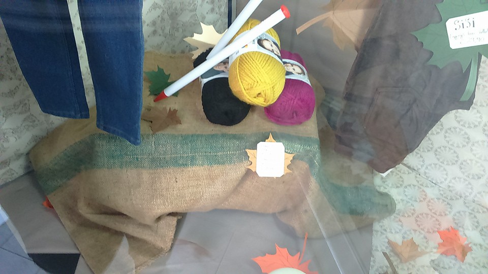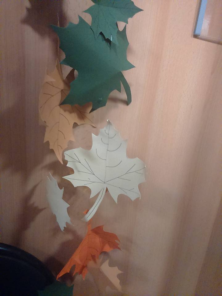 Ho creato le foglie con dei semplici cartoncini e le ho unite con del filo di nylon trasparente.I sacchi di iuta li ho usati, per coprire delle cassette della frutta e ho incentrato il tema autunnale sulla corda, ripetuta in tutta la vetrina.
