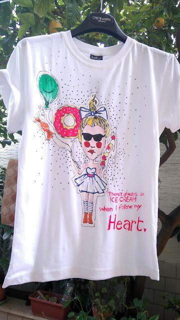 La t-shirt è di cotone elasticizzato ed è dedicatA a tutte le bimbe che possono essere "comprate" con un buon gelato. Parliamo di bimbe ma sappiamo che anche noi ormai grandicelle abbiamo la stessa reazione davanti ai dolcetti.VERO?