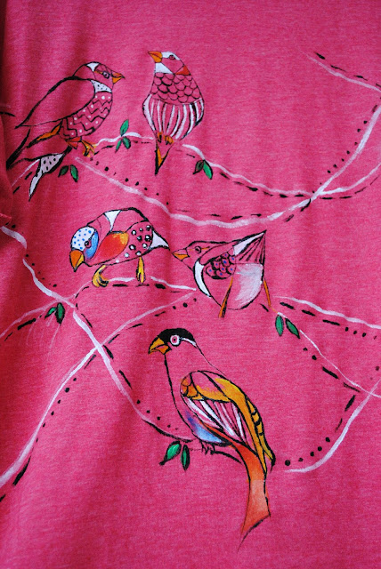 La base di questi bellissimi uccellini messi in varie posizioni sui rami era stata creata, ma il mio stile non era stato ancora aggiunto. Mentre dipingevo SUL TESSUTO (sperando di non creare robaccia) creavo le decorazioni mano a mano che andavo avanti senza avere nemmeno uno schema su cui basarmi.